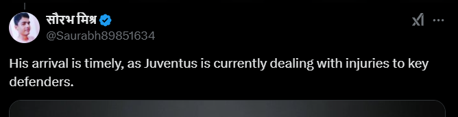 Saurabh89851634: «Его прибытие как раз вовремя, так как «Ювентус» сейчас сталкивается с травмами ключевых защитников».
