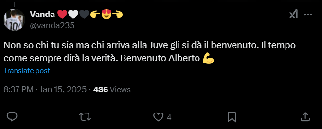 Vanda: «Не знаю, кто ты, но тот, кто приходит в «Ювентус», всегда получает приветствие. Время, как всегда, покажет правду. Добро пожаловать, Альберту!».