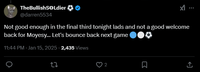 Darren5534: «Не хватило в завершающей стадии сегодня, ребята, и не лучший способ встретить Мойеса... Давайте исправим это в следующем матче».