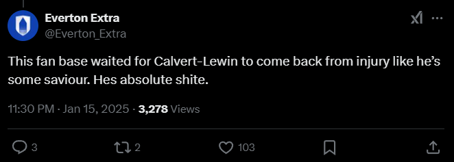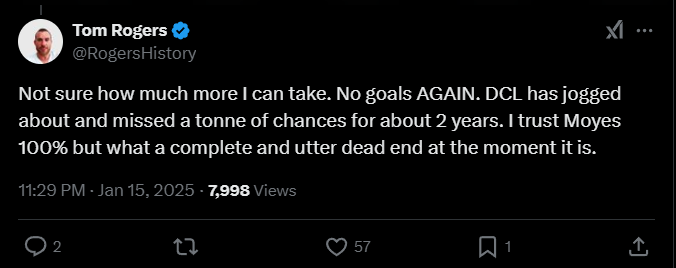 Tom Rogers: «Не уверен, сколько ещё могу это терпеть. Снова без голов. Калверт-Льюин бегает по полю и упускает кучу шансов уже около двух лет. Я доверяю Мойесу на 100%, но это полный тупик на данный момент».