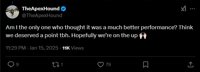 TheApexHound: «Мне одному кажется, что игра была намного лучше? Думаю, мы заслужили очко. Надеюсь, мы на подъеме».