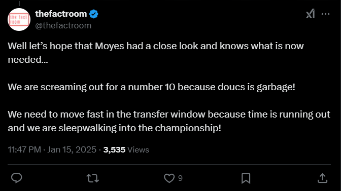 Thefactroom: «Ну, давайте надеяться, что Мойес внимательно все изучил и понимает, что нужно делать… Нам срочно нужен номер 10, потому что Абдулайе Дукуре – это ужас! Нужно действовать быстро в трансферное окно, потому что время уходит, а мы как будто на автопилоте идем в Чемпионшип!».