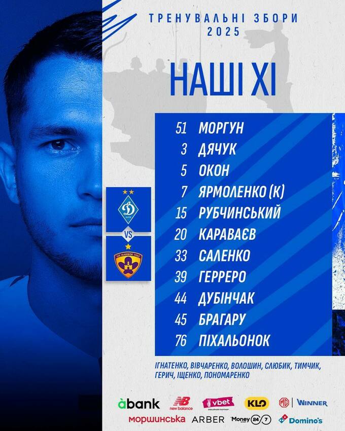 Динамо Киев: Моргун, Дячук, Окон, Ярмоленко (к), Рубчинский, Караваев, Саленко, Герреро, Дубинчак, Брагару, Пихаленок.
