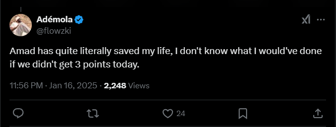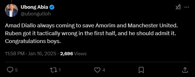 Ubong Abia: «Амад Диалло всегда приходит на помощь Амориму и «Манчестер Юнайтед». Рубен ошибся с тактикой в первом тайме, и он должен это признать. Поздравляем ребят».