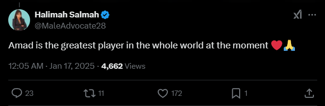 Halimah Salmah: «Амад – величайший игрок во всем мире на данный момент».