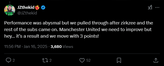 JZthekid: «Выступление было ужасным, но мы выстояли после выхода Зиркзее и остальных запасных. «Манчестер Юнайтед» нам нужно совершенствоваться, но... это результат, и мы ушли с 3 очками!».