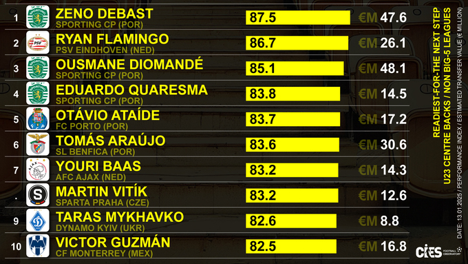 Возглавил рейтинг бельгийский центрбек «Спортинга» Зено Дебаст – 87,5 балла (47,6 млн евро). В топ-3 также входят Райан Фламинго из ПСВ и Усман Диоманде из «Спортинга».