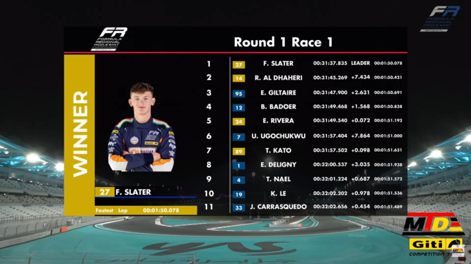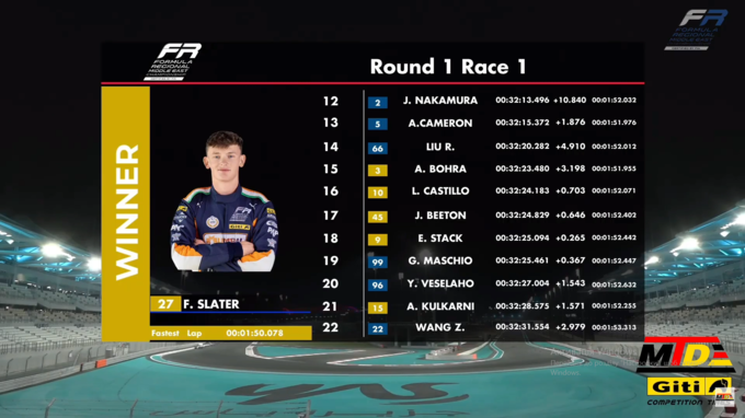 Фредди Слейтер, доминируя, побеждает в своей дебютной гонке на этапе в Абу-Даби FRMEC. Британец в прошлом году провел чемпионский сезон за Prema Racing в Итальянской Формуле-4, одержав рекордные 11 побед из 15 возможных.