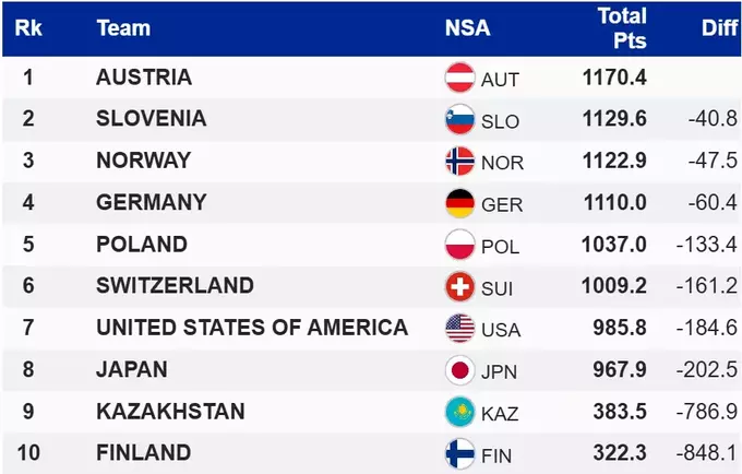 По результатам турнира первую строчку заняла сборная Австрии, имея звездный состав. Команда оторвалась от ближайшего конкурента более чем на 40 баллов. Вторыми и третьими финишировали сборные Словении и Норвегии соответственно.