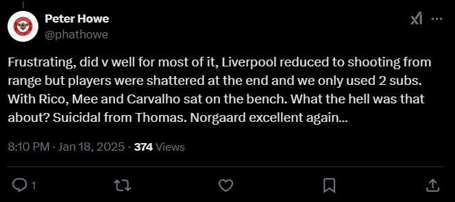 Peter Howe: «Разочаровывающе, играли хорошо большую часть матча, «Ливерпуль» ограничился ударами издалека, но в конце игроки были вымотаны, а мы использовали только 2 замены. Рико Генри, Бен Ми и Карвалью сидели на скамейке. Что это вообще было? Суицидально со стороны тренера. Нергор снова отличный».