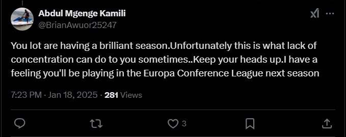 Abdul Mgenge Kamili: «У вас отличный сезон. К сожалению, вот что может произойти из-за недостатка концентрации… Держитесь! У меня есть ощущение, что в следующем сезоне вы будете играть в Лиге конференций».