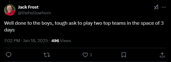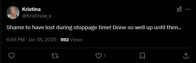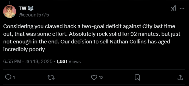 TW: «Учитывая, что в последний раз вы отыграли два мяча против «Сити», это было достойное усилие. Абсолютно железная защита в течение 92 минут, но в итоге этого оказалось недостаточно. Наше решение продать Нейтана Коллинза явно устарело».