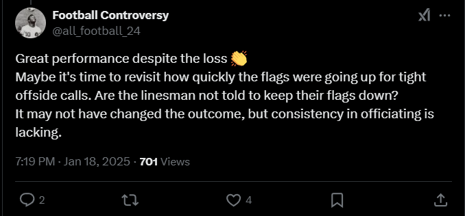 Football Controversy: «Отличная игра, несмотря на поражение. Может, стоит пересмотреть, как быстро поднимаются флаги при спорных случаях с офсайдами? Разве судям на линии не говорят не поднимать флаг в сомнительных ситуациях? Это, возможно, не изменило бы исход матча, но последовательности в судействе явно не хватает».