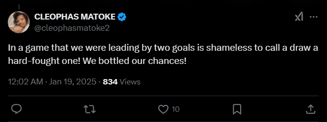 CLEOPHAS MATOKE: «В игре, в которой мы вели в два мяча, бессовестно называть ничью упорной борьбой! Мы упустили свои шансы!».