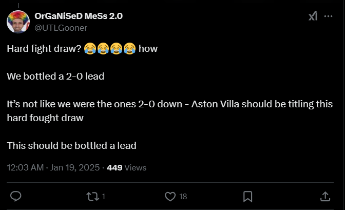 UTLGooner: «Тяжелая ничья? Как так? Мы упустили преимущество 2:0. Не мы были теми, кто проигрывал со счетом 0:2. «Астон Вилле» стоит называть это тяжелой ничьей. Мы должны были удержать этот перевес».