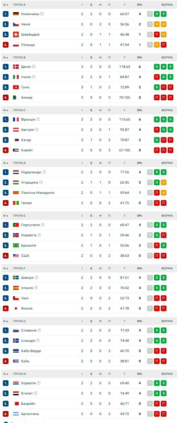 На ЧМ-2025 по гандболу уже определены 17 из 24 участников второго раунда: Германия, Дания, Италия, Тунис, Франция, Австрия, Катар, Нидерланды, Венгрия, Португалия, Норвегия, Швеция, Испания, Словения, Исландия, Хорватия, Египет гарантировали себе путевки во второй этап.