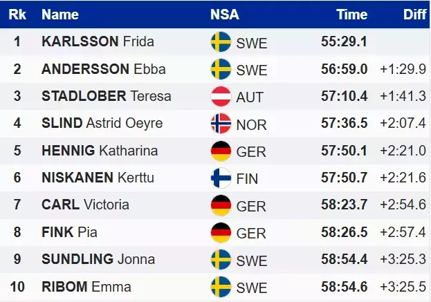 Почти шведский подиум сформировался по окончании гонки. Первой финишировала Фрида Карлссон с общим временем 55:29.1. За ней расположилась партнерша по сборной Эбба Андерссон, проигравшая лидеру 1 минуту и 2 секунды. А вот к третьей стала представительница Австрии Тереза Штадлобер.