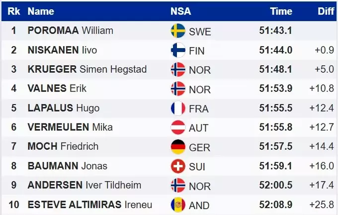 Дебютную победу на Кубке мира одержал участник из Швеции Вильям Поромя. Позади остался трехкратный чемпион Олимпиады Иво Нисканен с отставанием в 0.9 секунды. Тройку замкнул норвежец Симен Хегстад Крюгер.