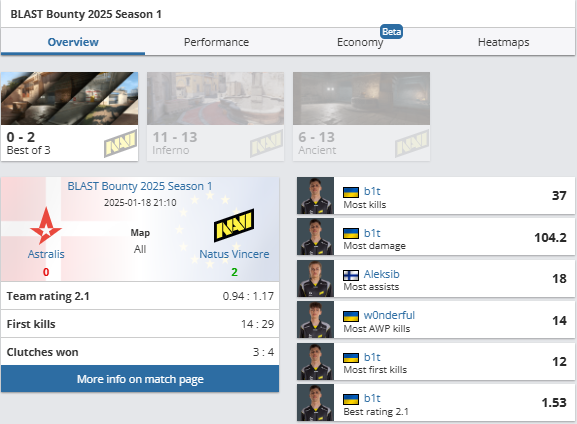 Natus Vincere обеспечили себе участие в первом LAN-турнире года на BLAST Bounty Finals, победив Astralis со счётом 2:0.