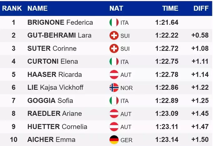 Первой в заезде стала итальянка Федерика Бриньоне, закрепившая собственное лидерство в общем зачете. Спортсменка завершила супергигант с общим временем 1:21.64. Второе и третье места заняли представительницы Швейцарии Лара Гут-Бехрами и Коринн Сутер соответственно.