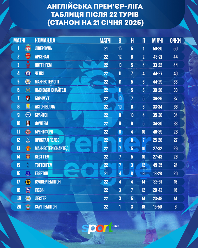 Лидеры АПЛ: Ливерпуль (50 очков), Арсенал, Ноттингем Форест (по 44), Челси (40), Ман Сити, Ньюкасл (по 38), Борнмут (37), Астон Вилла (36).