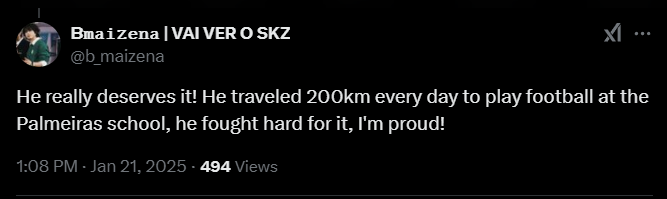 B_maizena: «Он действительно этого заслуживает! Каждый день он преодолевал 200 км, чтобы играть в футбол в школе «Палмейраса», он боролся за это, и я горжусь им!».