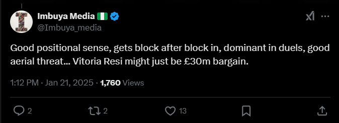 Imbuya_media: «Хорошее позиционное чутье, блокирует один удар за другим, доминирует в дуэлях, представляет опасность в воздушных единоборствах... Витор Рейс может оказаться настоящей выгодной покупкой за 30 миллионов фунтов».