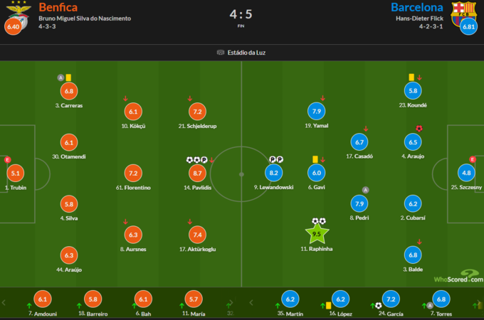 Матч закончился со счетом 5:4 в пользу «Барселоны». Украинский голкипер «Бенфики» Анатолий Трубин начал матч с первых минут. На 64-й минуте украинец неудачно выбил мяч, после чего Рафинья забил гол в ворота португальской команды. Статистический портал WhoScored оценил выступление Трубина в 5.1 баллов, что является худшим показателем в команде.