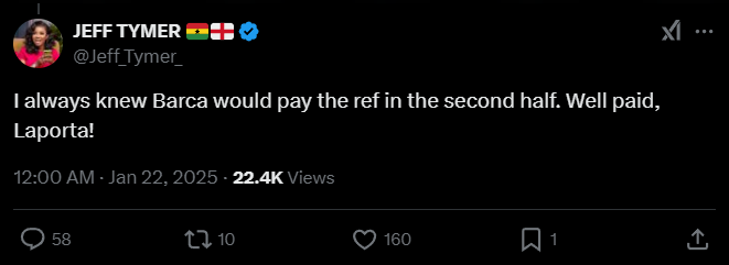 Jeff Tymer: «Я всегда знал, что «Барса» заплатит судье во втором тайме. Хорошо заплатили, Лапорта!».
