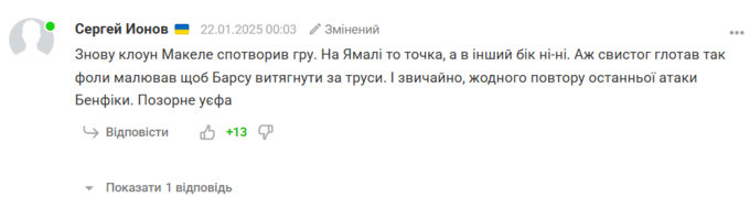 Сергей Ионов: «Опять клоун Маккели (судья) испортил игру. На Ямале то точка, а в другую сторону ни-ни. Аж свисток глотал, так фолы рисовал, чтобы «Барсу» вытащить за трусы. И, конечно, ни одного повтора последней атаки «Бенфики». Позорное УЕФА».