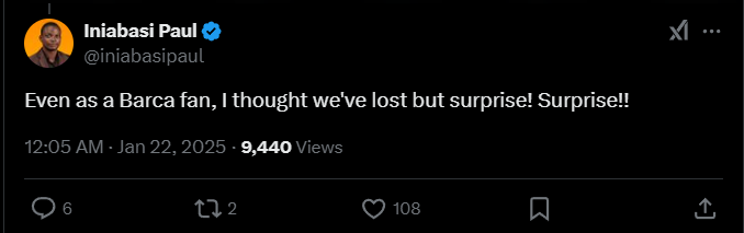 Iniabasi Paul: «Даже будучи болельщиком «Барсы», я думал, что мы проиграли, но сюрприз! Сюрприз!!!».