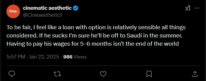 Cinematic aesthetic: «Честно говоря, мне кажется, что аренда с правом выкупа – относительно разумный вариант. Если он не справится, я уверен, что летом он уедет в Саудовскую Аравию. А платить ему зарплату в течение 5-6 месяцев – это не конец света».