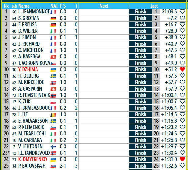 Лидер сборной Украины Юлия Джима в очередной раз выдала качественную гонку. Юлия ни разу не промахнулась на огневых рубежах, отдав все силы на последних километрах. В результате Джима финишировала на 10-й позиции.