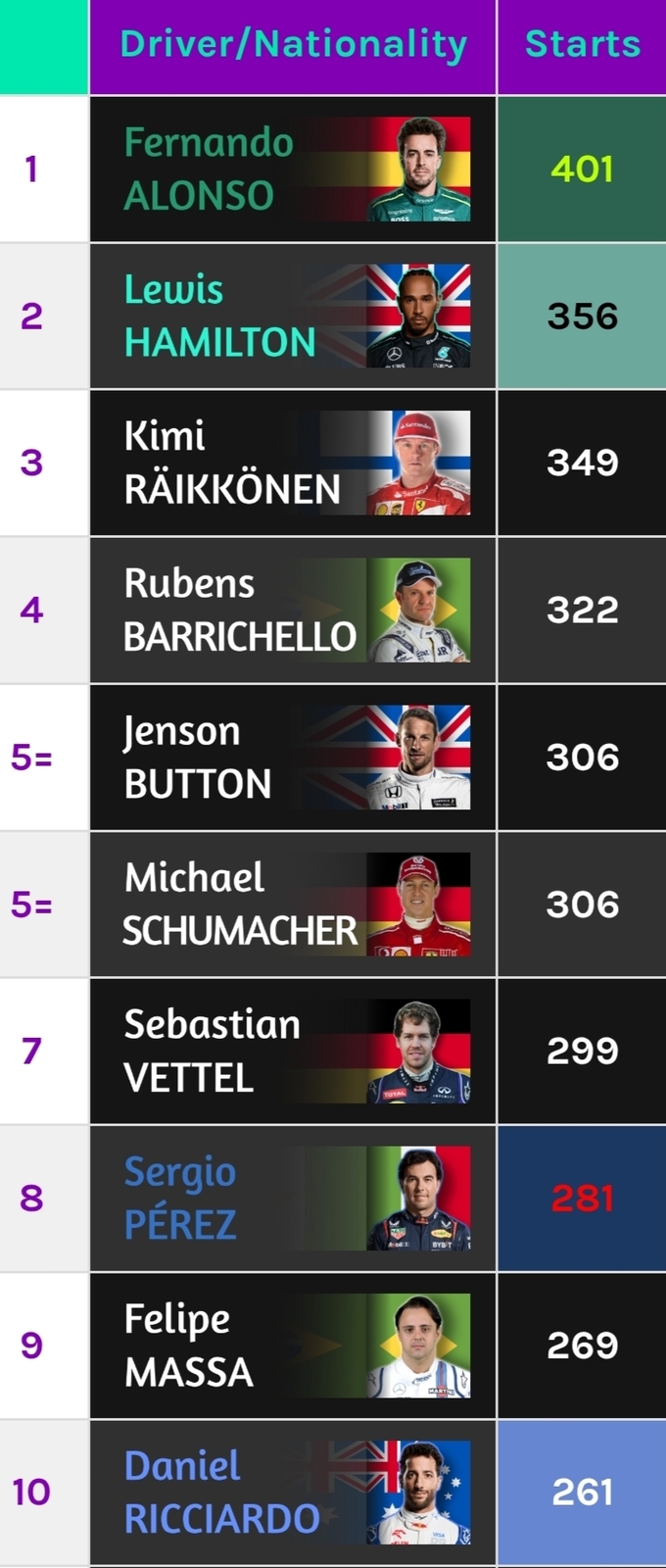 Пилоты с наибольшим количеством стартов в Формуле-1