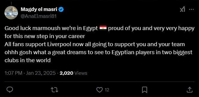 Magdy el masri: «Удачи Мармуш, мы в Египте гордимся тобой и очень рады этому новому шагу в твоей карьере. Все болельщики поддерживают Ливерпуль, теперь все будут поддерживать тебя и твою команду. О, Боже, какая прекрасная мечта увидеть египетских игроков в двух крупнейших клубах мира».