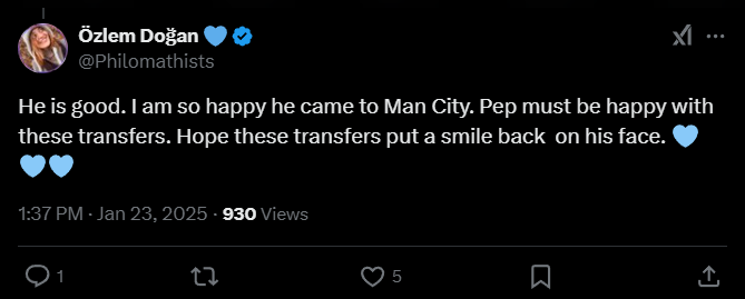 Özlem Doğan: «Он хорош. Я очень рад, что он перешел в «Манчестер Сити». Пеп должен быть доволен этими трансферами. Надеюсь, эти трансферы вернут улыбку на его лицо».