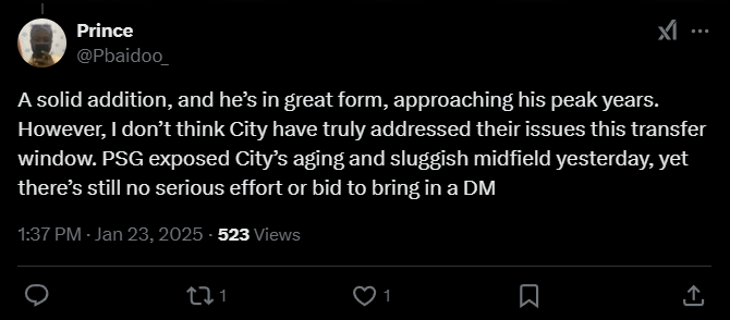 Prince: «Это солидное пополнение, и он находится в отличной форме, приближаясь к своему пику. Однако я не думаю, что «Сити» действительно решил свои проблемы в это трансферное окно. «ПСЖ» вчера продемонстрировал слабости средней линии «Сити», которая стала медленной и устаревшей, а серьезных усилий или предложений на приобретение опорного полузащитника так и не последовало».