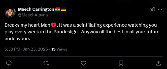 Meech Carrington: «Разбивает мне сердце, чувак. Это был блестящий опыт, наблюдать за твоей игрой каждую неделю в Бундеслиге. В любом случае, всего наилучшего во всех твоих будущих начинаниях».