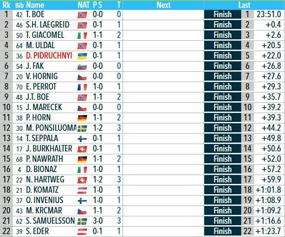 В топ-3 спринтерской гонки вошли норвежцы Тарьей Бе, Стурла Легрейд и итальянец Томмазо Джакомель. 4-ю позицию занял Мартин Улдаль из Норвегии, опередивший Пидручного на 1,5 сек.