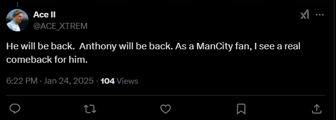 Ace II: «Он вернется. Энтони вернется. Даже как болельщик «Ман Сити», я вижу его настоящее возвращение».