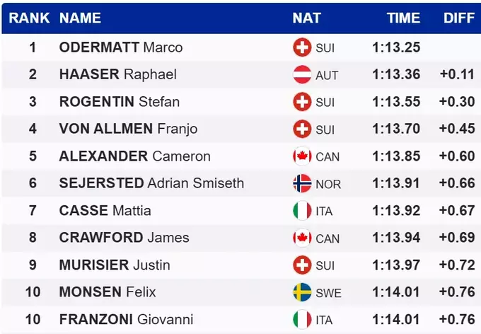 Опередив ближайшего конкурента на 0.11 секунды, первую строчку занял швейцарец Марко Одерматт. За ним расположился представитель Австрии Рафаэль Хаазер, а вот тройку замкнул Стефан Рогентин.