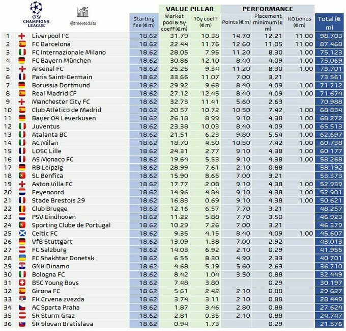 Лидером является «Ливерпуль», у которого в активе 98,78 млн евро заработанных призовых.