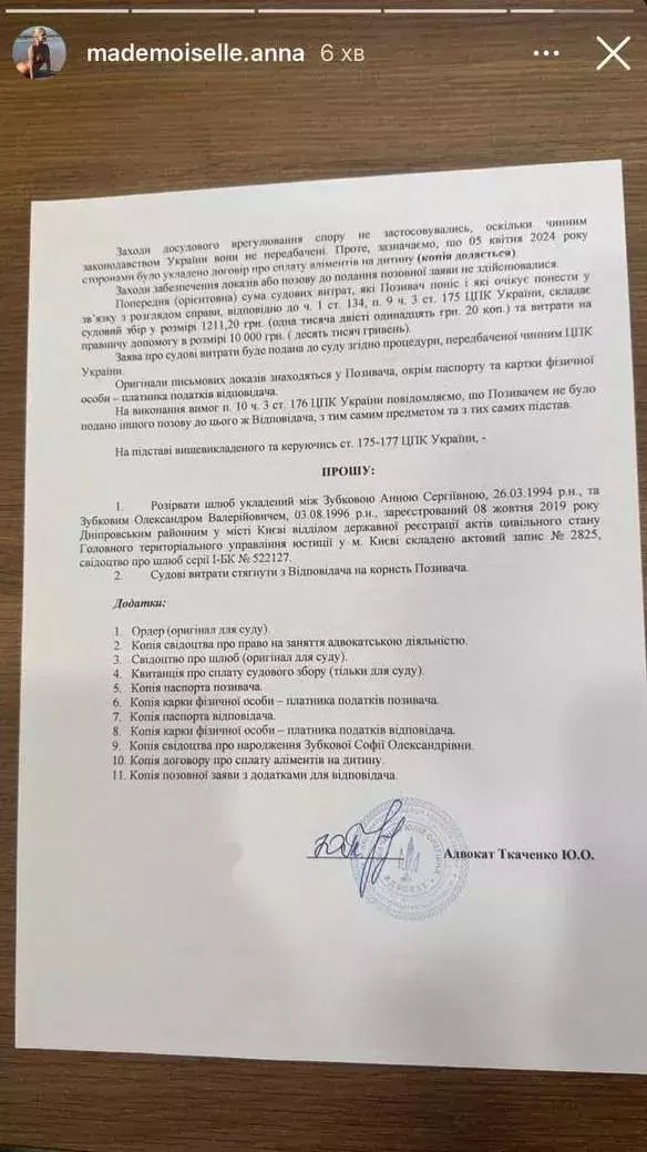 Жена футболиста «Шахтера» и сборной Украины Александра Зубкова, Анна Зубкова, шокировала всех заявлением о разводе, текст которого она опубликовала в сторис Instagram.