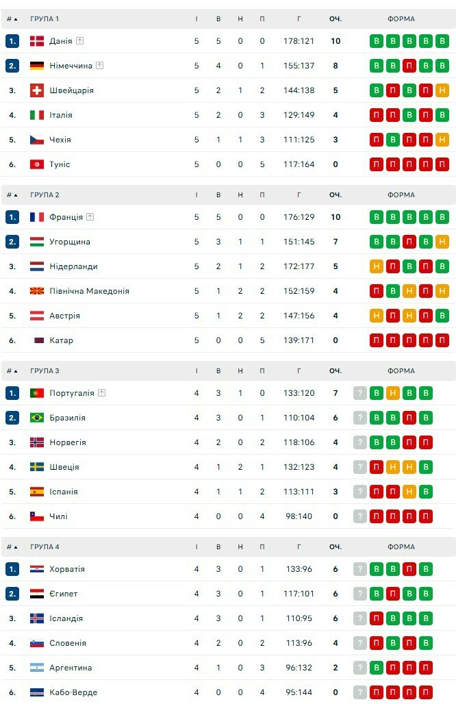 Уже известны 6 из 8 сборных, которые имеют путевки в четвертьфинал: Дания, Германия, Франция, Венгрия, Португалия, Бразилия.