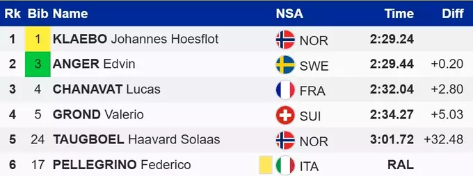 Победителем спринта стал норвежец Йоханнес Клэбо, завершивший гонку с общим временем 2:29.24. Проиграв лидеру 0.20 секунд, вторую позицию занял Эдвин Ангер из Швеции. В тройку лучших вошел француз Лукас Шанават.
