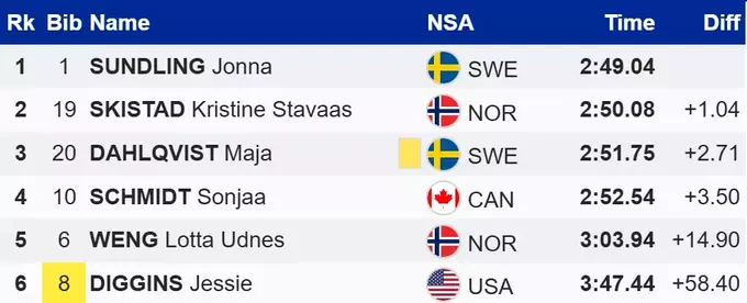 На первом месте в гонке оказалась шведская представительница Йонна Сундлинг, оторвавшаяся от ближайшей конкурентки на 1.04 секунды. Вторая ступенька за норвежкой Кристин Шистад, третья – Майя Дальквист из Швеции.