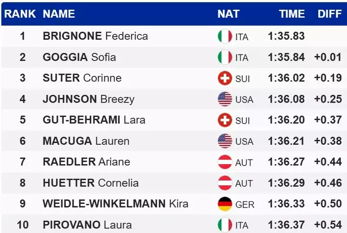 Пятую победу в этом сезоне одержала итальянка Федерика Бриньоне, которая на 0.01 секунды оторвалась от ставшей второй партнерши Софьи Годжи. В топ-3 также вошла швейцарка Корин Сутер.