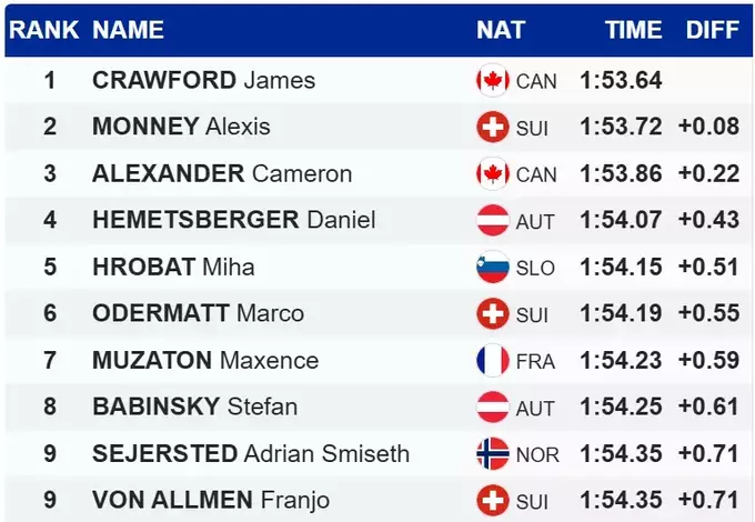 Впервые в карьере на КС триумфатором стал спортсмен из Канады Джеймс Кроуфорд. Вторую позицию занял швейцарец Алексис Монне, проигравший лидеру 0.08 секунды. Третий – Кэмерон Александер из Канады.