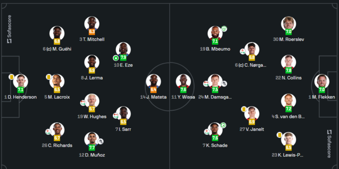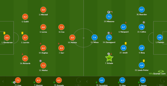 Украинский полузащитник «Брентфорда» Егор Ярмолюк появился на поле на 84-й минуте вместо получившего повреждение Кевина Шаде. Результативными действиями не отличился. Статистический портал SofaScore оценил игру украинца в 6.4 балла из 10 возможных, WhoScored дал Егору оценку в 6.1 балла. Лучшим игроком матча по версии SofaScore стал полузащитник хозяев Эберечи Эзе с оценкой 7.9. Лучшим по версии ShoScored признан Кевин Шаде. Его игру оценили в 8.0 из 10 возможных баллов.