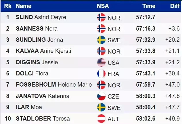 Четвертую победу в своей карьере одержала норвежская лыжница Астрид Слинд, завершившая гонку с общим временем 57:12.7. За ней расположилась партнерша по команде Нора Саннесс.
